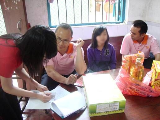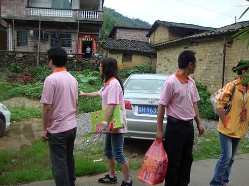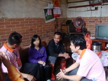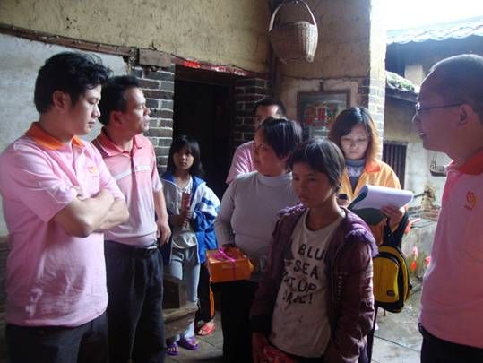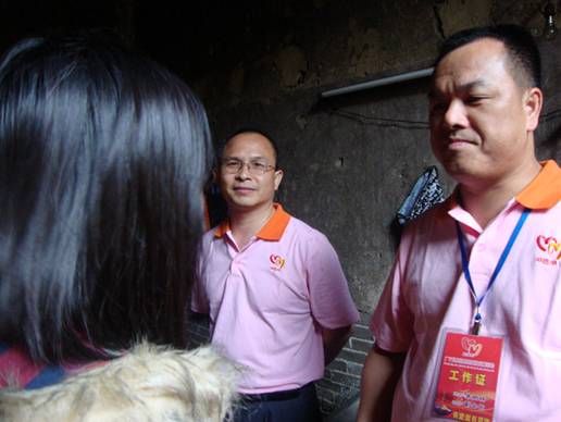 2011年5月14日,广宁县心连心助孤扶贫慈善会在副会长朱树林、副会长聂浩峰的带领下,组织探访队伍对螺岗镇受助小孩进行了探访,为受助小孩带去了生活必需品,祥细了解目前他们的实际情况。其中由义工团资助的李彩云,由于缺乏大人的照顾,屋内环境十分脏乱,去年8月份重新布置的电线及用电设备已经出现残缺,村委主任现场承诺负责处理;和外公外婆一齐生活的阿娣,二老一少没有其他经济来源,泥砖屋由于年久失修,多处出现漏雨,在朱树林副会长的带动下,现场发动捐款作为房屋的修葺专用款,朱会长并鼓励阿娣积极面对困难,努力学习,发奋向上,他会支持阿娣直到她毕业为止!